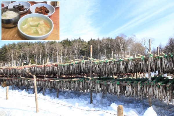 【韓国の旬メシ068】スケトウダラを野外で自然乾燥させる、ファンテ(황태)。冬にとれたものを風通しのよい山間部に運び、冷凍と解凍を繰り返しながら春までうま味を凝縮させます。江原道の平昌、麟蹄が名産地です。