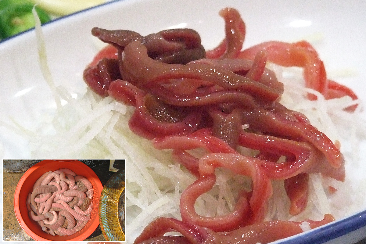 【韓国の旬メシ090】ユムシを刺身にした、ケブルフェ(개불회)。通年で見るものの真冬が旬の食材です。見た目で敬遠されることも多いですが、醤油にちょっと浸して食べると、身が締まってシコシコ甘く美味しいのです。