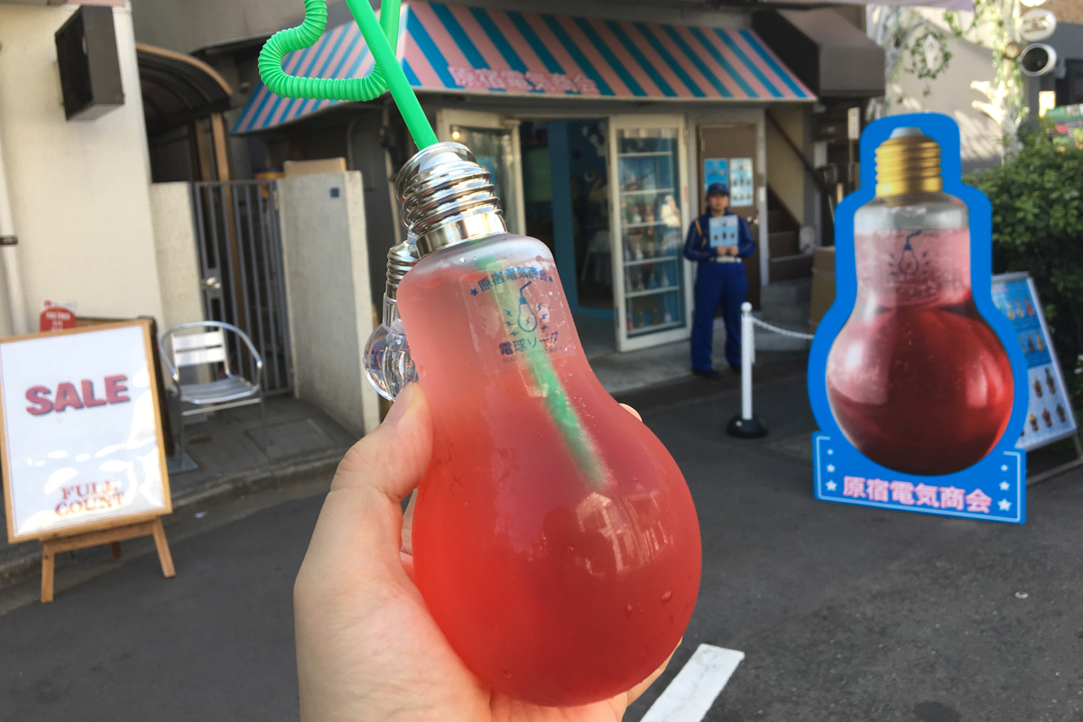 【日本の韓メシ074】2017年夏に話題となった韓国発の、電球ソーダ。この写真は原宿で撮ったものですが、お祭りの屋台などでも定番に。数年後に第3次韓流を振り返ったとき、チーズタッカルビやチーズドッグとともにインスタ映えを語る象徴的なアイテムになっているかもしれません。