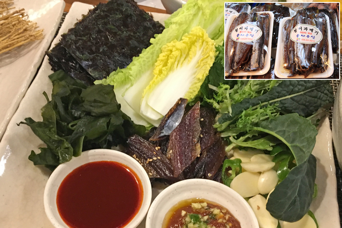 【韓国の旬メシ106】ニシンを生干しにした、チョンオクァメギ(청어과메기)。慶尚北道浦項市における冬の郷土料理です。最近はサンマで作ることが多いですが、本来はニシンで作りました。海苔やワカメと一緒に賞味。