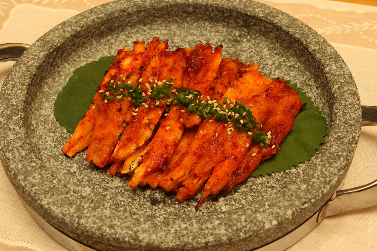 【韓国の旬メシ109】ツルニンジンに薬味ダレを塗って焼いた、トドックイ(더덕구이)。高麗人参のようなほろ苦さがあり、よく叩いて下ごしらえをするとジャキジャキとした食感が軽快です。寒い時期の2月頃が旬です。