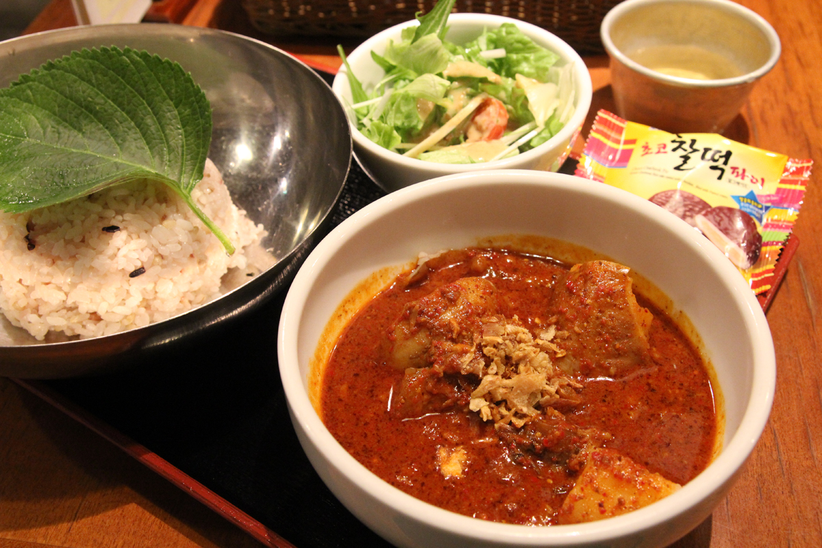 【日本の韓メシ079】カムジャタン(豚の背骨とジャガイモの鍋)をカレーにするアレンジ。カムジャタンを自慢とする店のランチメニューでした。既存の韓国料理をベースに、カレー風にするとの発想はまま見ます。サムゲタンカレーとか、タットリタンライスとか。夏向けにもいいですね。