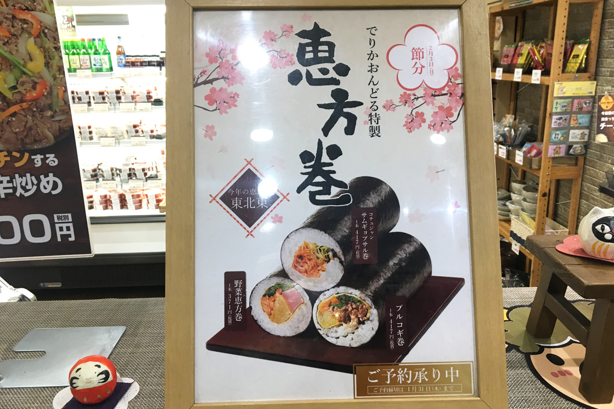 【日本の韓メシ080】本日は節分。韓国に節分の習慣はありませんが、新大久保では韓国式の恵方巻(恵方キムパプ?)が売られていたりします。写真は「でりかおんどる」の予約受付案内。コチュジャンサムギョプサル巻、プルコギ巻、野菜恵方巻の3種があります(許可を得て撮りました)。
