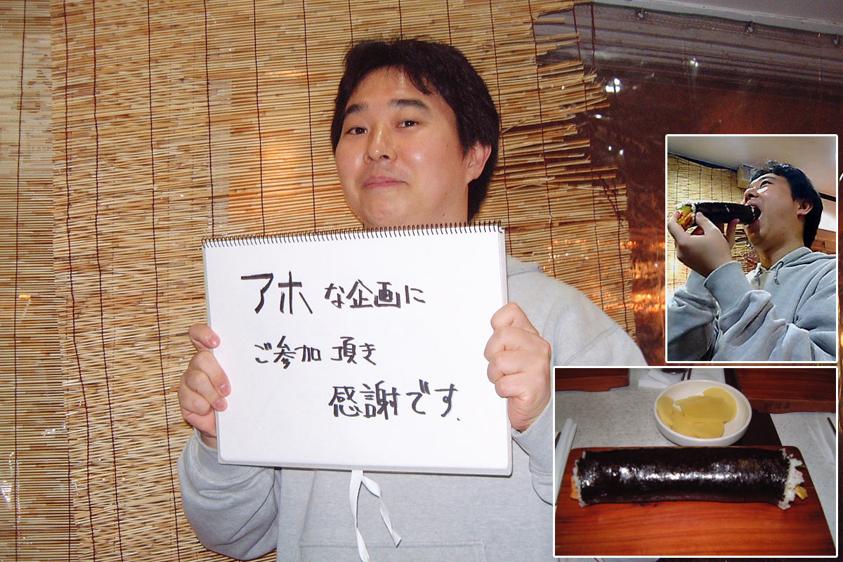 新大久保における恵方キムパプの歴史は2006年から(自称)。ワタクシを含む総勢7名で当時あった専門店に集まり、特注した切らないキムパプをまるかぶりしました。無言で食べるものということで、全員無言で集合し、無言のまま食べ、無言のまま店を出るというアホな企画でした。