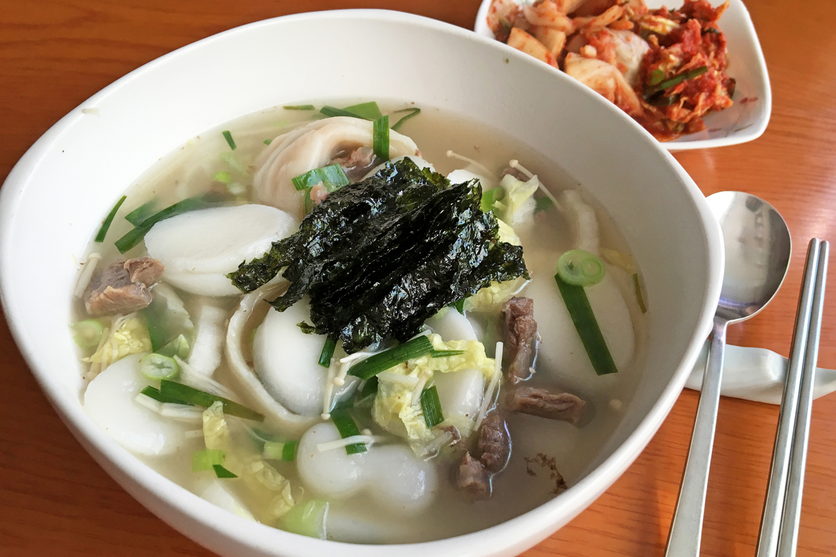 【韓国の旬メシ112】旧正月の定番料理が、トックッ(雑煮、떡국)。うるち米で作った棒状の餅(長寿を象徴)を小判型(富裕を象徴)にスライスし、牛肉のスープに入れて食べます。餃子を加える家庭もあります。