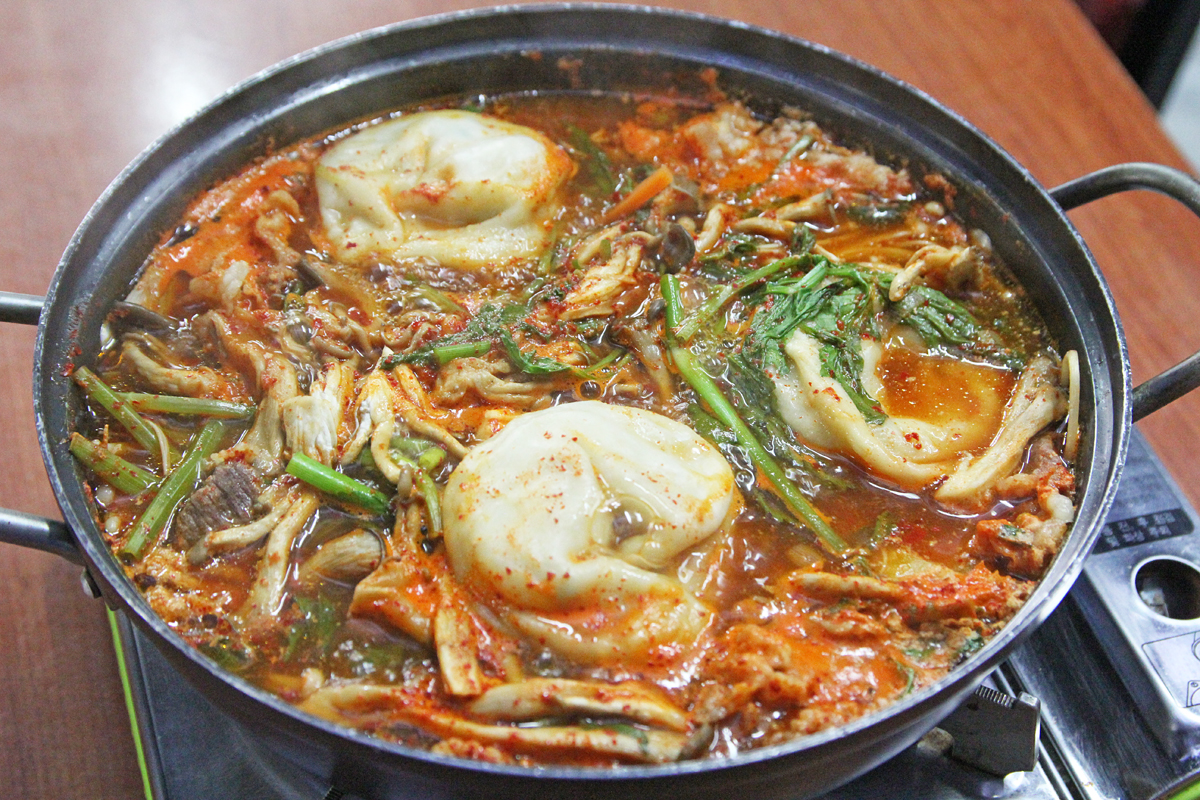 【韓国の旬メシ119】ごろんと大きな餃子を鍋に仕立てた、マンドゥジョンゴル(餃子鍋、만두전골)。写真の餃子には豚肉、豆腐、緑豆モヤシなどが具として入っていました。皮が分厚くもちもちでボリュームたっぷり