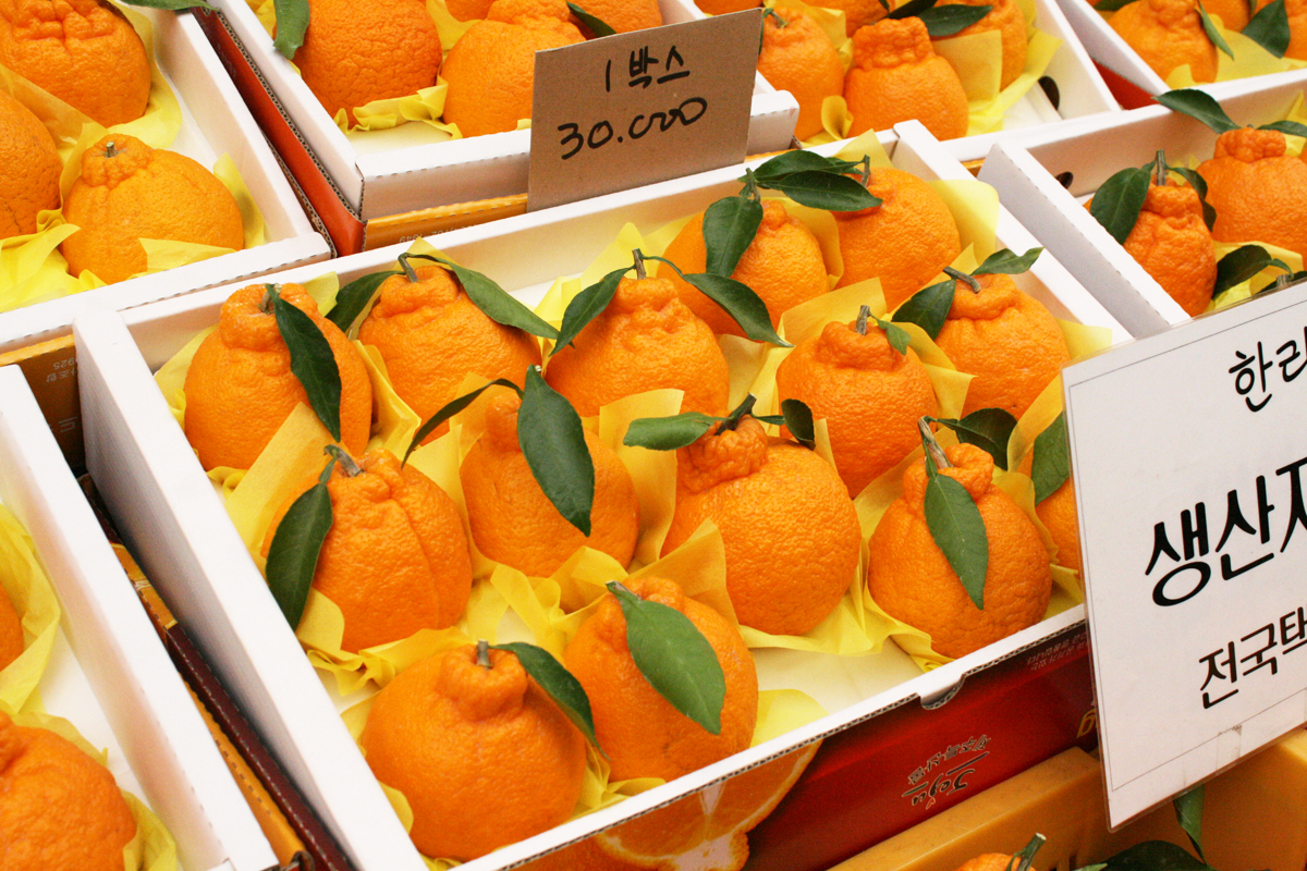 【韓国の旬メシ120】済州島名産の、ハルラボン(デコポン、한라봉)。漢字では「漢拏峰」と書いて、済州島の象徴である漢拏(ハルラ)山に見立てています。12月から春まで出回りますが、2月頃が最盛期とされます。