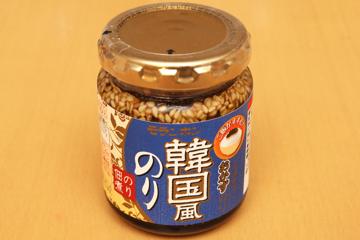【日本の韓メシ088】モランボンの「韓国風のり」。ラベル左下にも書いてありますが、海苔の佃煮を韓国風にした商品で、ゴマ油、ニンニク、唐辛子などが入っています。香ばしい風味とピリ辛の味わいは白いごはんとの相性抜群。油が分離するのでよくかき混ぜてからごはんに載せましょう。