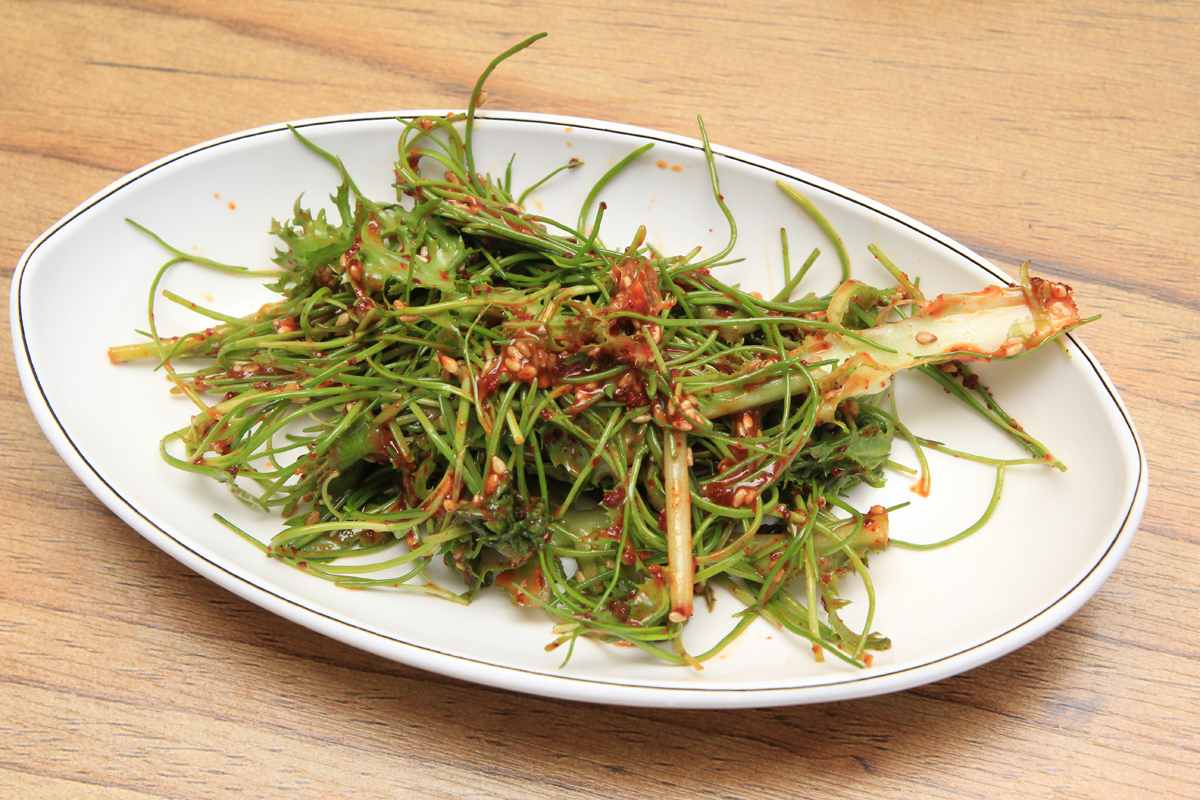 【韓国の旬メシ132】ウシオツメクサを和え物にした、セバルナムルムチム(세발나물무침)。2000年代半ばから栽培が始まり、ここ数年は春になると見かける機会が増えました。塩生植物の一種でほんのり塩気があります。