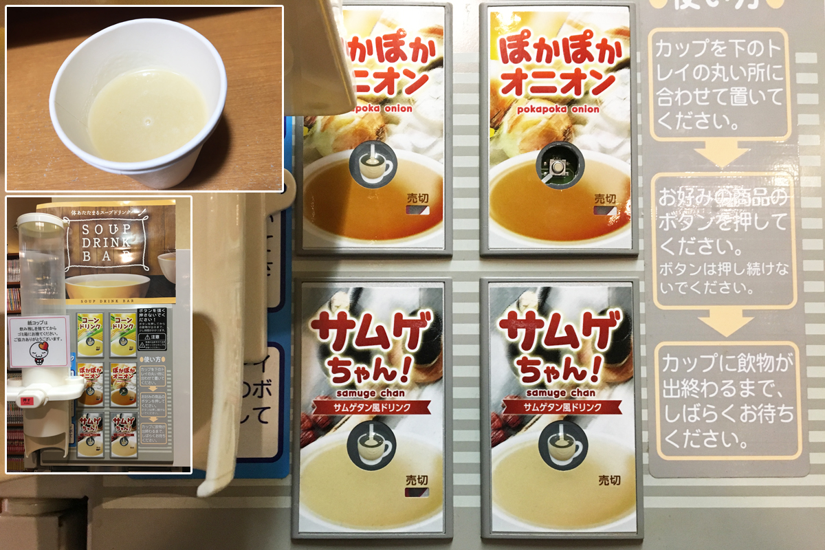 【日本の韓メシ099】漫画喫茶のドリンクバーに入っていたサムゲタン風ドリンク、サムゲちゃん!。サムゲタンがこうしてコーンスープやオニオンスープと肩を並べているのは感慨深いですね。やや塩気を強めに、鶏ダシとショウガの風味を効かせて、とろみをつけたホットドリンクでした。