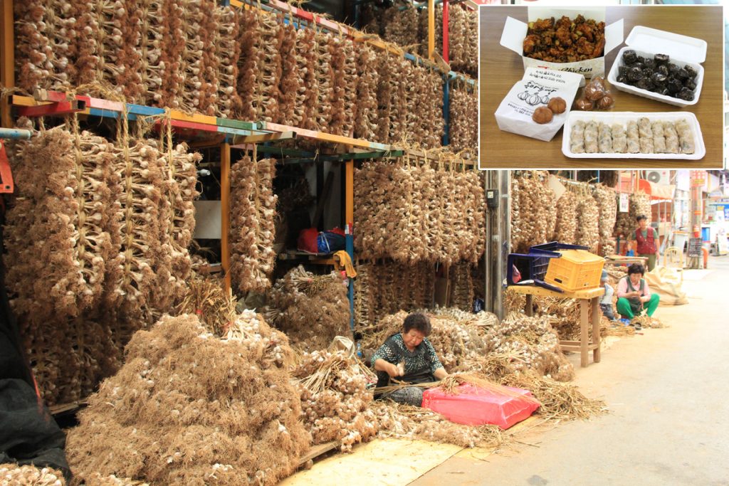 【韓国の旬メシ162】忠清北道丹陽郡の九景市場。韓国ではいまがニンニクの収穫期なので、産地の市場にはこれから大量のニンニクが並びます。写真は昨年の7月3日に撮影。市場内は自慢のニンニクを使ったグルメも満載です。