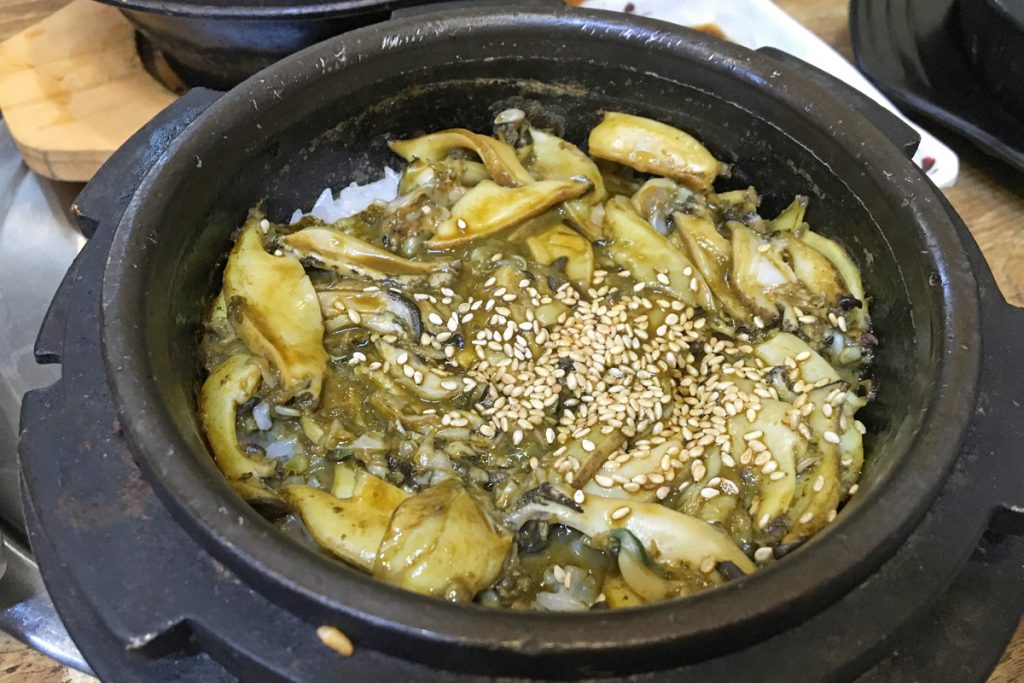 【#韓国絶品グルメ30選 015】アワビの釜飯(済州特別自治道)。韓国語ではチョンボクトルソッパプ。アワビの名産地である済州ならではの炊き込みごはんです。肝も一緒に入れるので磯の香りが満載。よくかき混ぜてから食べますが、このとき店によってはバター(マーガリン)を加えたりもします。