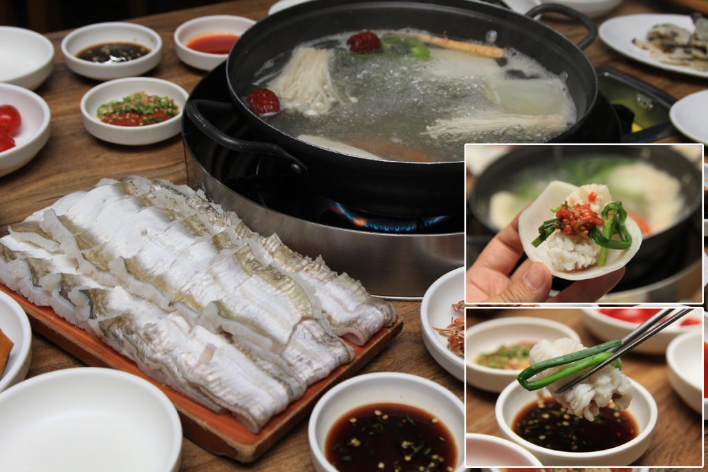【韓国の旬メシ167】ハモを韓方スープでしゃぶしゃぶにする、ハモユビキ(하모유비끼)。全羅南道の麗水が有名で、日本語のハモ湯引きがそのまま使われています。5~9月が最盛期。韓方醤油につけるか、生タマネギに載せて。