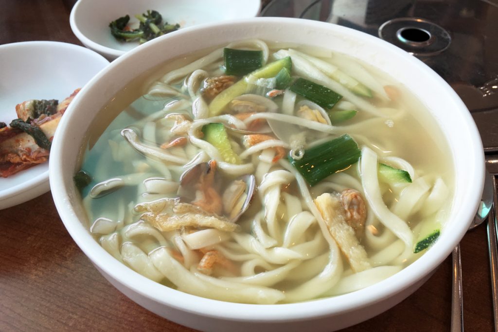 【#韓国絶品グルメ30選 019】カルグクス(忠清南道舒川郡など)。西海岸沿いの各地域はアサリ、ハマグリなどの貝類が豊富にとれます。これらの地域では魚介をたっぷり入れたカルグクス(手打ちうどん)が名物。写真は隣町の保寧で撮ったもの。干しダラ、エビなども入ってダシの味わいが濃厚でした。