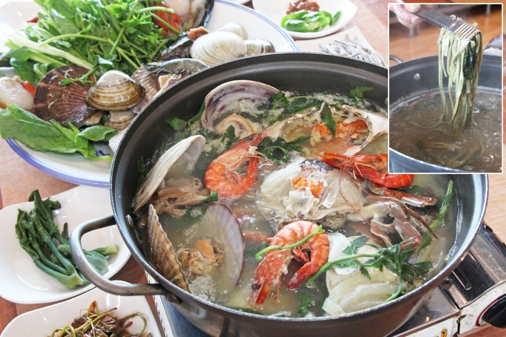 こちらは舒川の馬良浦口で食べたヘムルシャブシャブ(海鮮しゃぶしゃぶ)。ひと通りの魚介をしゃぶしゃぶで食べた後、残ったスープに、同じく地域の名産である海苔を練り込んだカルグクス(手打ちうどん)を投入します。麺をすすると濃厚な魚介ダシのうま味とともに、海苔の香りがふわっと漂います。