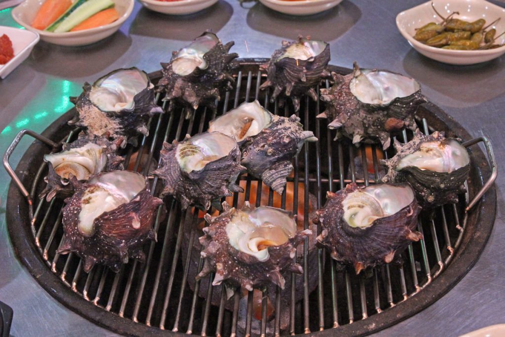 【韓国の旬メシ168】初夏から夏にかけて旬を迎えるサザエ(소라)の網焼き。サザエのツノは環境によってあったりなかったりですが、ツノのあるサザエをプルソラ(뿔소라)、ないサザエをチャムソラ(참소라)と呼び分けます。