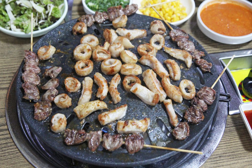 【#韓国絶品グルメ30選 022】マクチャン(大邱広域市)。マクチャンはギアラ(牛の第4胃)、または豚の直腸を指し、これを炭火、練炭などで網焼きにします。大邱の地下鉄アンジラン駅近くには豚のマクチャン、コプチャン(小腸)などを焼いて食べる店が集まっており、名物通りとして賑わっています。