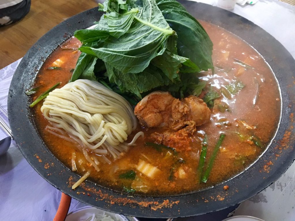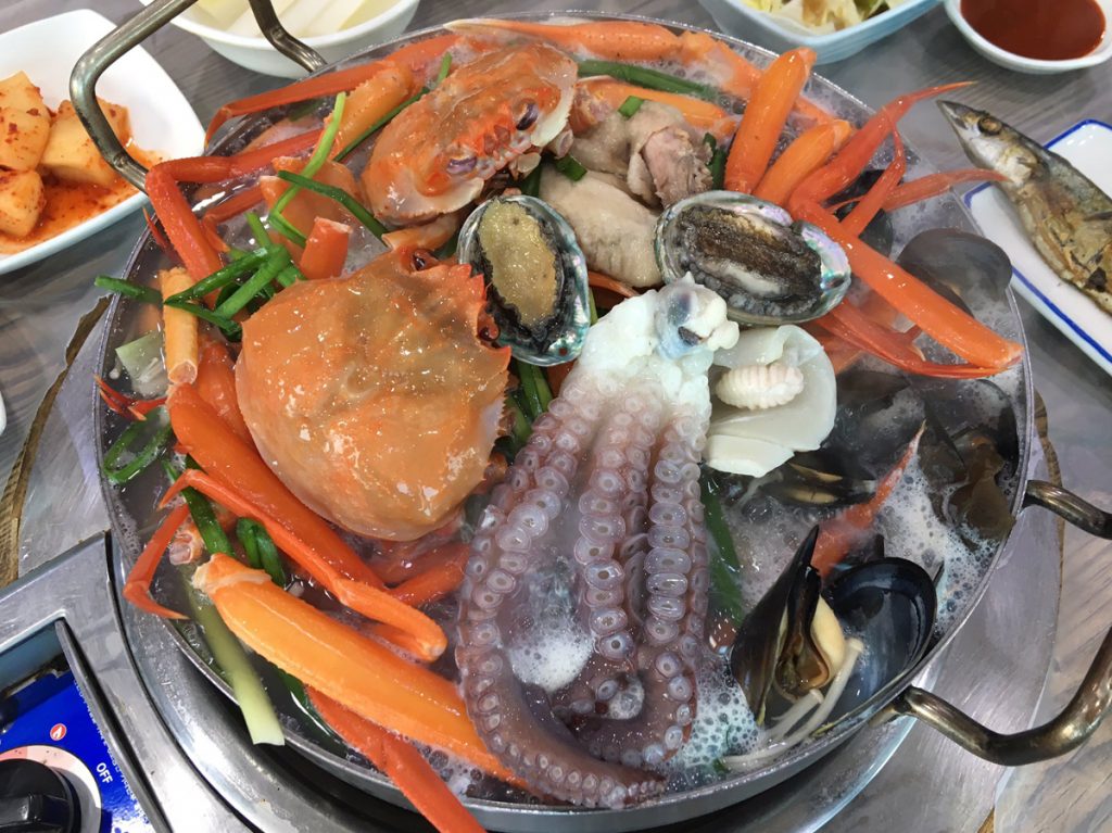これを食べに江陵(カンヌン)へ来ました。ヘゲタン(海産物と鶏肉の鍋、해계탕)。丸鶏、ベニズワイガニ、活マダコ、活アワビ、ムール貝、ハマグリ、ホタテ、タイラギなどが入っています。これで2人前。シメのラーメンまで夢中で食べました。