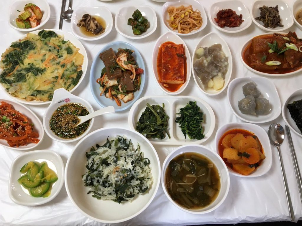 旌善(チョンソン)にてコンドゥレバプ(アザミの葉の炊き込みごはん)。ジャガイモ、山菜料理の副菜とともに。