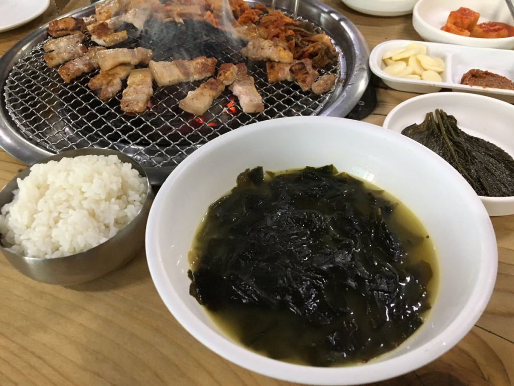 原州(ウォンジュ)にある炭焼き窯の朝ごはん。江原道は炭の名産地として有名です。あくまでもミヨックッ (ワカメスープ)がメインですが自慢の炭で焼いたサムギョプサルも味見程度に追加。炭を取り出した後の窯はチムジルバン(サウナ)として利用します。