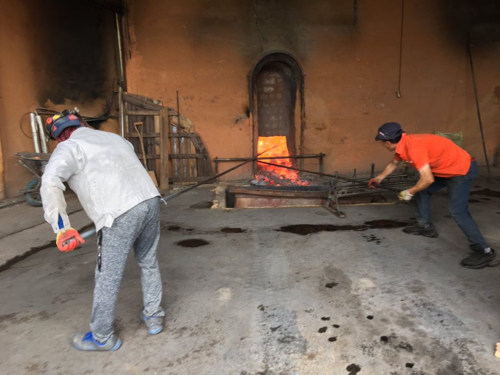 8日間かけて焼いた炭を出すところまで見学しました。長い鉄の棒を差し入れて、窯の手前に設置した鉄箱の中にかきだします。すごい熱。遠く離れていても顔が焼けるようです。