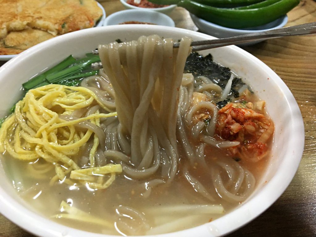 寧越(ヨンウォル)名物のチッククス。名産である葛粉を使ったカルグクス(手打ちうどん)で、小麦粉と5対5で生地を作るそうです。とろみの強いスープともっちりした麺。ジャガイモチヂミはなんと2枚重ねで出てきました。