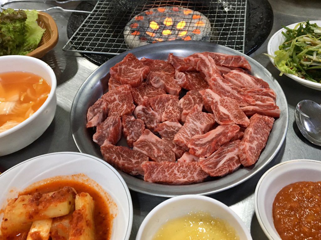 太白(テベク)は焼肉が名物。畜産が盛んというよりも炭鉱で働く人たちが仕事終わりに食べたことから発達しました。炭鉱の町ゆえに炭火ではなく練炭で焼き、お値打ちであることを表す「実費(シルビ)」を店名に掲げる店が多いです。