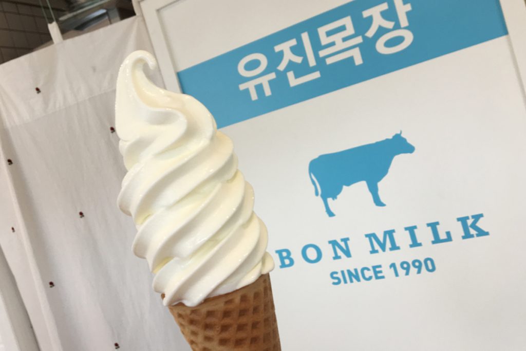 【韓国の旬メシ175】夏に美味しいソフトクリーム。韓国ではソフトアイスクリーム(소프트 아이스크림)と呼ぶことも多いです。写真はアイスでいちばんに思いついた蔚山「BON MILK」のもの。ミルクが濃厚で熱烈おすすめです。