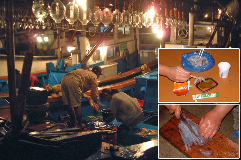 【韓国の旬メシ177】夏に旬を迎えるヤリイカの刺身、ハンチフェ(한치회)。写真は名産地である済州島で、帰港したばかりの漁船から直接買って刺身にしてもらい、そのへんに座って食べたもの。2002年夏撮影。若かりし頃のいい思い出です。