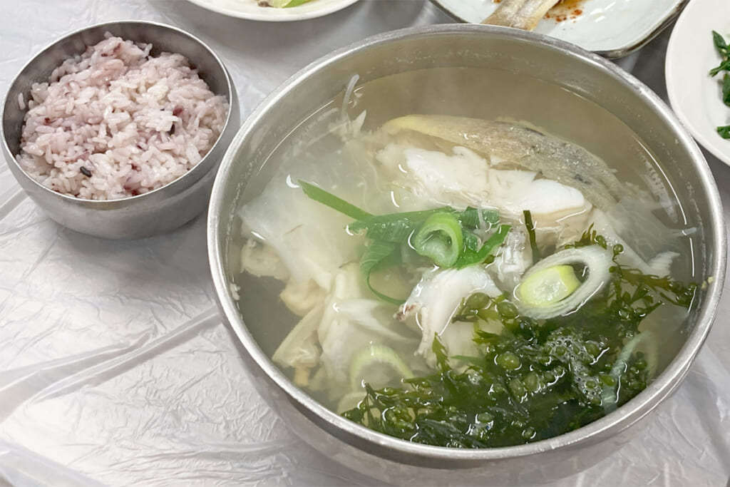 海の幸の下見で難しいのは、季節の壁があること。3月のツアーに向けて想定した旬の料理にはまだ早いので、作り方がほぼ同じというムルメギタン(クサウオと海藻のスープ/물메기탕)をいただきました。とろとろの白身と澄んだスープが絶品。これが春になってどう変わるかはツアーのお楽しみとしましょう。