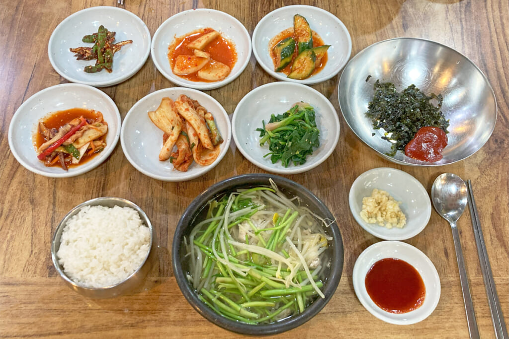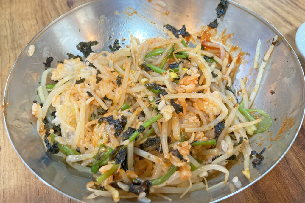 たっぷりのセリと豆モヤシは、海苔と唐辛子酢味噌(초고추장)の入った器に移し、ごはんと混ぜて食べるのが流儀。固城、泗川あたりの食べ方と思っていましたが、大邱発祥との説もあり背景が気になっています。