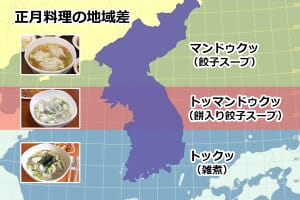 - トックッはソルラル(설날)の料理として親しまれるが、朝鮮半島の北部(平安道、咸鏡道、黄海道)ではマンドゥクッ(餃子スープ/만두국)を、中部(京畿道、江原道)ではトッマンドゥクッ(餅入り餃子スープ/떡만두국)を食べることが多く、トックッは主に南部(忠清道、慶尚道、全羅道)地域で優勢だとされる。もちろん家庭によってもさまざまであり、あくまでも傾向の目安に過ぎない。