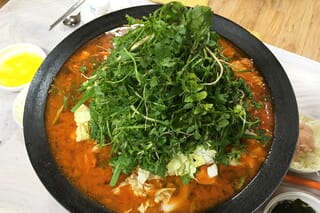 ナズナ入りのムルタッカルビ。江原道太白市黄池洞「太白タッカルビ(태백닭갈비)」にて2019年10月27日撮影。