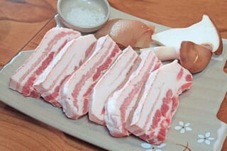 オギョプサル。済州道西帰浦市大静邑上摹里「ウリオモン食堂(우리어멍식당)」にて2018年1月15日撮影。