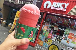 スイカを搾った生フルーツジュース。ソウル市中区明洞1街「JUICY明洞店(쥬씨 명동점)」にて2018年9月2日撮影。