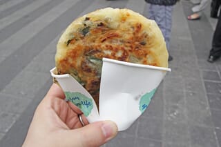 ヤチェホットク。釜山市中区南浦洞5街「南大門野菜ホットク(남대문 야채호떡)」にて2012年6月11日撮影。