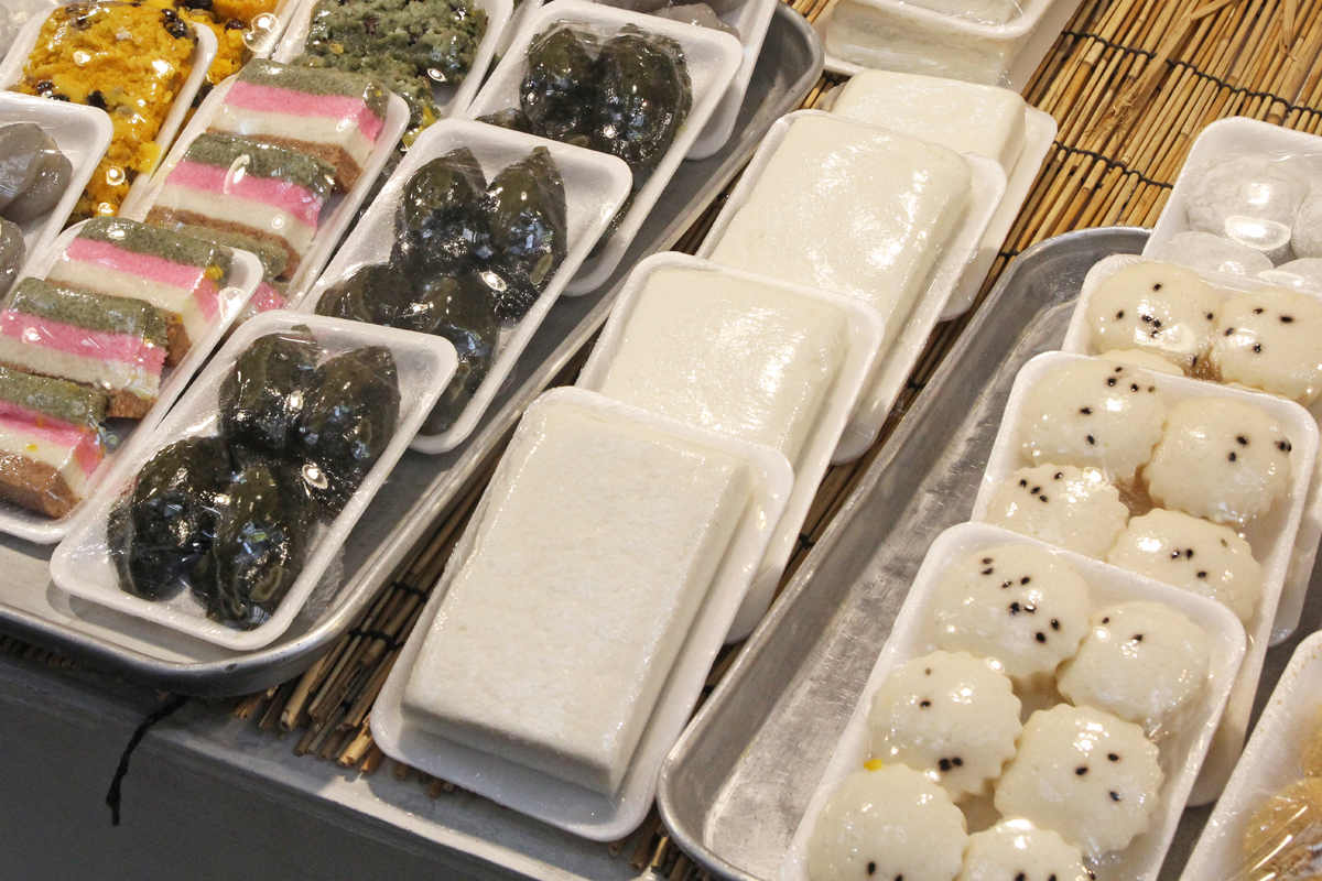 市場で売られているいろいろな餅。ソウル市松坡区馬川洞「馬川中央市場(마천중앙시장)」にて2015年2月9日撮影。