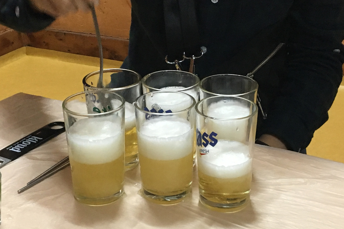 ポクタンジュ(ソメク)を作っているところ。江原道横城郡屯内面屯内路「ヘンボカンパプサン(행복한 밥상)」にて2018年4月25日撮影。