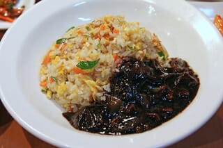 チャジャン(ジャージャー麺の黒味噌)をかけたポックムパプ。東京都荒川区荒川「東京ガーデン」にて2010年3月20日撮影。