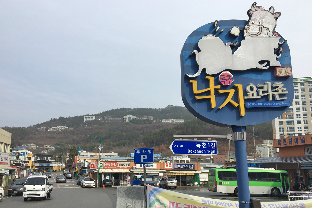 霊岩郡鶴山面犢川里のバスターミナル前に設置された「テナガダコ料理村(낙지요리촌)」の看板。2019年3月6日撮影。