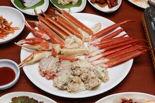 テゲ(ズワイガニ)とホンゲ(ベニズワイガニ)の盛り合わせ。慶尚北道蔚珍郡厚浦面金音里「ペガムテゲマート(백암대게마트)」にて2015年10月5日撮影。