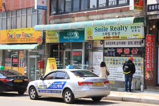 英文表記の看板が並ぶ新場洞の街並み。2013年3月31日撮影。