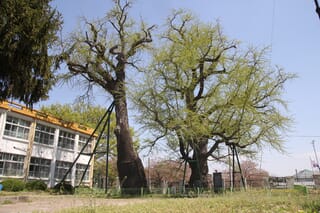 沔川面に2本並ぶ樹齢1100年のイチョウの木。2017年4月19日撮影。