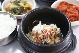 ウロンイサムパプ(タニシの包みごはん)。忠清南道唐津市新平面道城里「テアウロンイ専門食堂(대아우렁이전문식당)」にて2017年4月18日撮影。