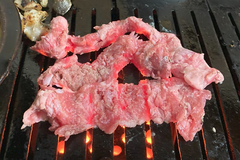 豚のオドルピョ。練炭の火で焼きながら、ハサミで食べやすい大きさに切って食べる。光州市西区治坪洞「ヌナネ練炭グイ(누나네연탄구이)」にて2023年11月29日撮影。
