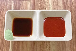 刺身用のワサビ醤油(左)とチョゴチュジャン(唐辛子酢味噌)。2023年11月16日撮影。