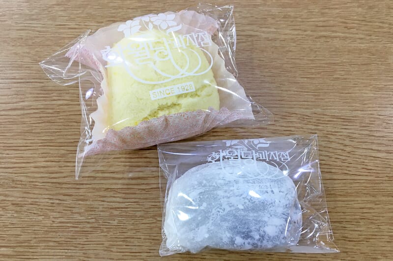 「花月堂(화월당)」のチャプサルトク(手前)とボールカステラ。2019年4月25日撮影。