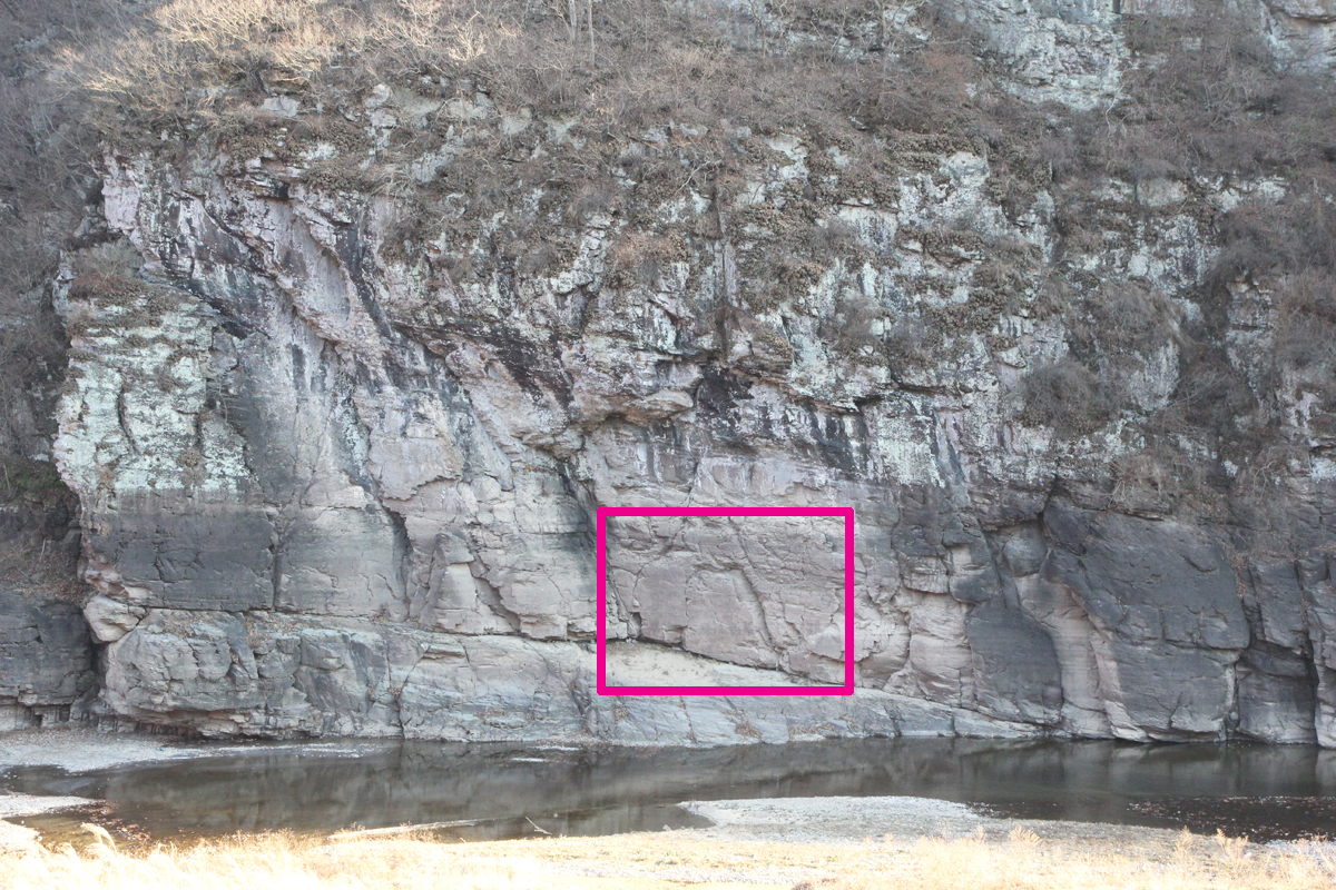 盤亀台岩刻画(枠線で囲んだ場所に描かれているが画像上は見えない)。2016年1月13日撮影
