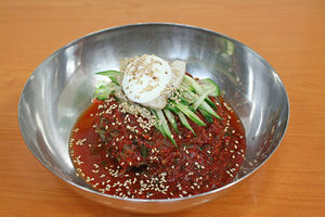 - 辛い薬味ダレに麺を絡めて味わうミルミョン。ピビムミョン(비빔면)とも呼ぶ。薬味ダレは粉唐辛子、醤油、ゴマ油、砂糖、ニンニク、ネギ、韓方材などを混ぜ合わせて作り、店によっては果物の汁などを混ぜることもある。