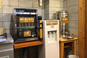 - 専門店ではお茶がわりにユクス(肉ダシのスープ、육수)を提供する。主にヤカンで提供されるので、これをコップに注いで飲む。